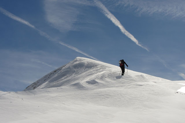 Estoy tentado de acompañarles y bajar esquiando hasta el Bunker. Cuando ya estoy casi decidido, unas nubes feas suben rápidamente y cambio de opinión (también se me haría muy tarde). El día finalmente no se estropeó del todo, pero tampoco hizo calor por arriba.