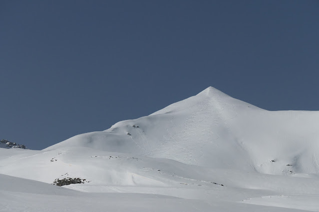 Allí no sopla el aire y el sol aprieta. Tanto que una de mis focas se nieve a pegarse de nuevo a la suela, pero misterios de la química y las nuevas siliconas, tras dos despegues que ya parecían definitivos, consigo llegar a la cumbre sin cambiar de focas (seguro que si no hubiera llevado las de recambio, no hubieran querido pegarse de nuevo...)