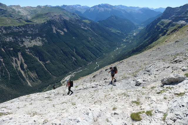 Para hoy, ya con los cuerpos cansados de los dos días anteriores, tenemos un plan muy tranquilo. Una rápida visita a Sarrios 6 y volvemos hacia el Lago helado del Perdido. De allí, "saltamos" por el collado del Cilindro y bajamos por la pedrera y lo que queda del glaciar, una fotos y al destrepe. Con cuidado, bajamos el resalte y nos vamos a la parte alta del altiplano de Marboré. Por horario, podíamos bajar esa misma tarde al coche, pero preferimos partir el descenso del Balcón para otra jornada. Deambulamos un buen rato hasta encontrar un sitio bueno para vivaquear. Tras más de una hora dando vueltas a la perdiz, ningún sitio nos convencía al 100%, el aire tuvo a bien calmarse, y entonces, casi cualquier sitio plano era bueno. Descansamos la tarde