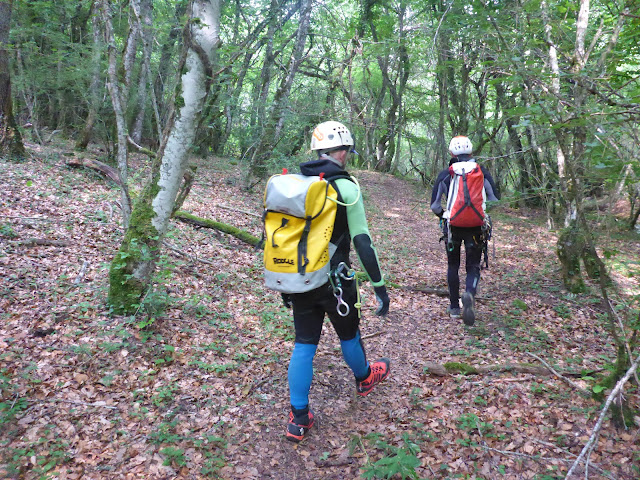 Cuando los rapeles dejan de tener continuidad y nos toca andar unos metros, es indicador de que ya se acaba el recorrido. Se observa un tramo donde se dinamitó par enderezar el trazado de la tubería. Unos pocos resaltes y una par de raples saltables más y se acaba el barranco. De nuevo volví a perder material en el descenso, llevo una racha...🙈