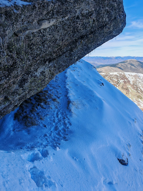 Pienso que lo mejor es dar la vuelta, toca subir lo que llevo bajado. Subiendo me encuentro con los de Valladolid, que finalmente decidieron venir por aquí también. Les digo que voy a tratar de subir en busca de la Senda Mala, y se dan la vuelta también. La subida la hacemos mejor que la bajada, siguiendo el sendero llegamos al Pico Hornillo. Justo con las últimas luces, empezamos la Senda Mala, que con la nieve no es del todo evidente, pero conseguimos seguirla, antes de que sea necesario encender el frontal (aunque el grupo de Valladolid van sin frontal). En un punto, creo que se puede bajar directo al río, nos la jugamos y salió bien. Bajamos bastante bien, sin problemas, ayudados por la nieve no fue del todo incómodo. Ya en la senda, pasamos por uno de los puentes y subimos a la carretera. Sin contratiempos alcanzamos el parking de la Serrá y poco después el coche en el cruce de Tejeros.